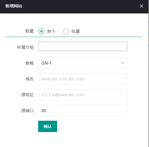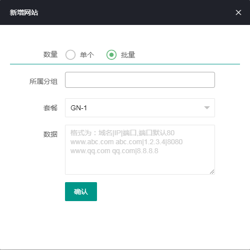 点击左侧菜单“网站管理”-》“我的网站”进去网站列表,点击工具栏上的“新增”按钮,弹出添加网站窗口,在数量栏切换到批量。如图:
