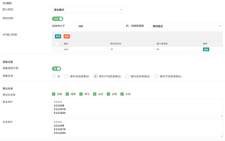 API接口防御:当默认规则开启了如浏览器识别,滑动验证,验证码等规则时,如果直接调用API,会触发这些防cc规则,导致访问API失败。这时候可以添加例外,设置这些API只采用请求频率来防CC