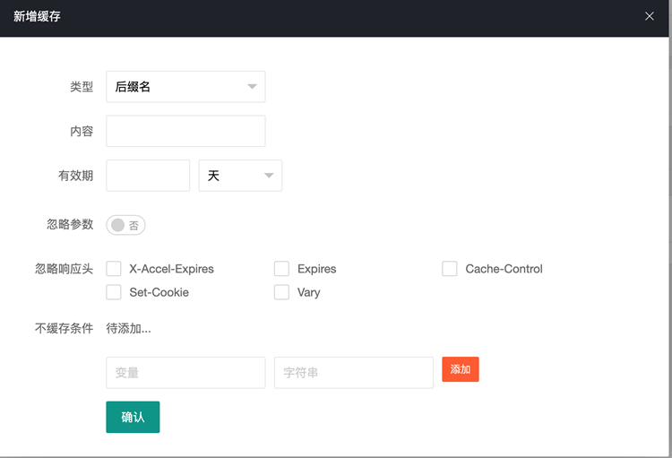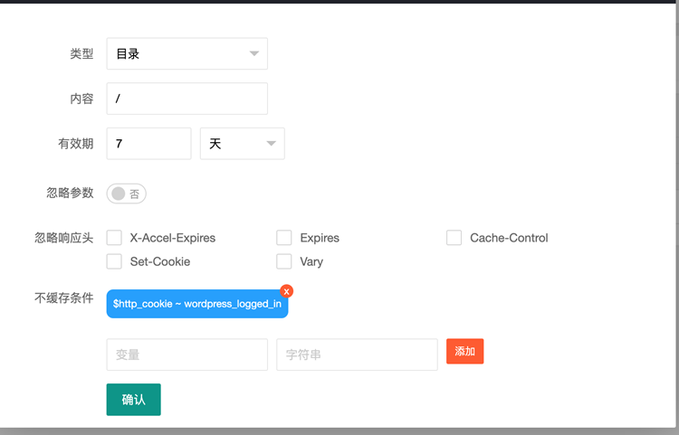 不缓存条件:设置某一特定的请求不缓存,比如缓存了整个网站除了客户端带指定cookie名为wordpress_logged_in的请求,那么可以变量输入$http_cookie,字符串输入wordpress_logged_in