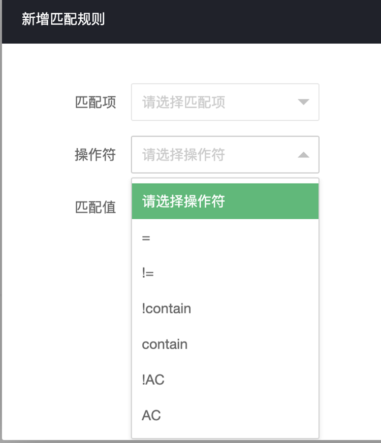 AC:Aho-Corasick算法匹配,简称AC,可以同时对多个值进行匹配,任意一个值匹配成功就算匹配了。多个值以逗号分隔,如匹配项为ip,操作符为AC,匹配值192.168.0.1,192.168.0.2,表示匹配客户端的IP是否为192.168.0.1或者192.168.0.2,如果是其中一个,就算匹配了